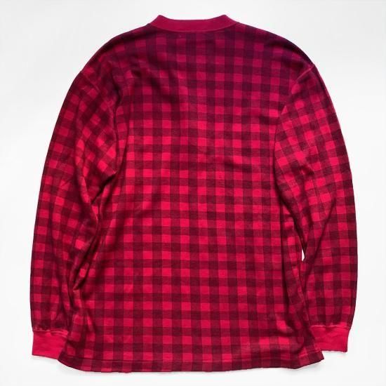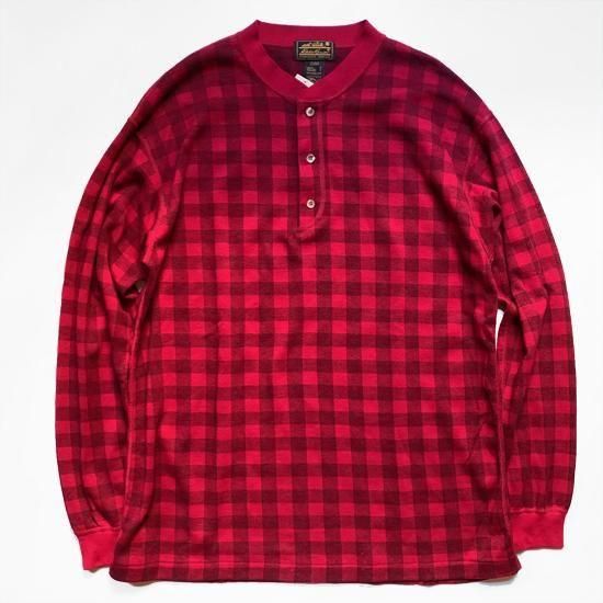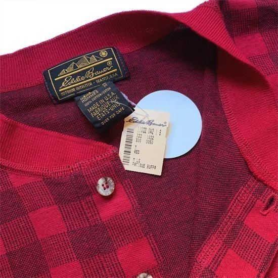 ギアなどクラシックアウトドアアイテムでもお馴染みのエディーバウアーの80年代のコットンヘンリーカットソーのデッドストック品が入荷しました。3つボタンのヘンリーネック、生地は伸縮もあるコットンの鹿の子織りのチェック柄。未洗いゆえ縮みがでていないので、大きめの方は乾燥機をかけてガッチリ縮ませて着るのもオススメ。シャツレイヤードのアクセントとしてもオススメです。